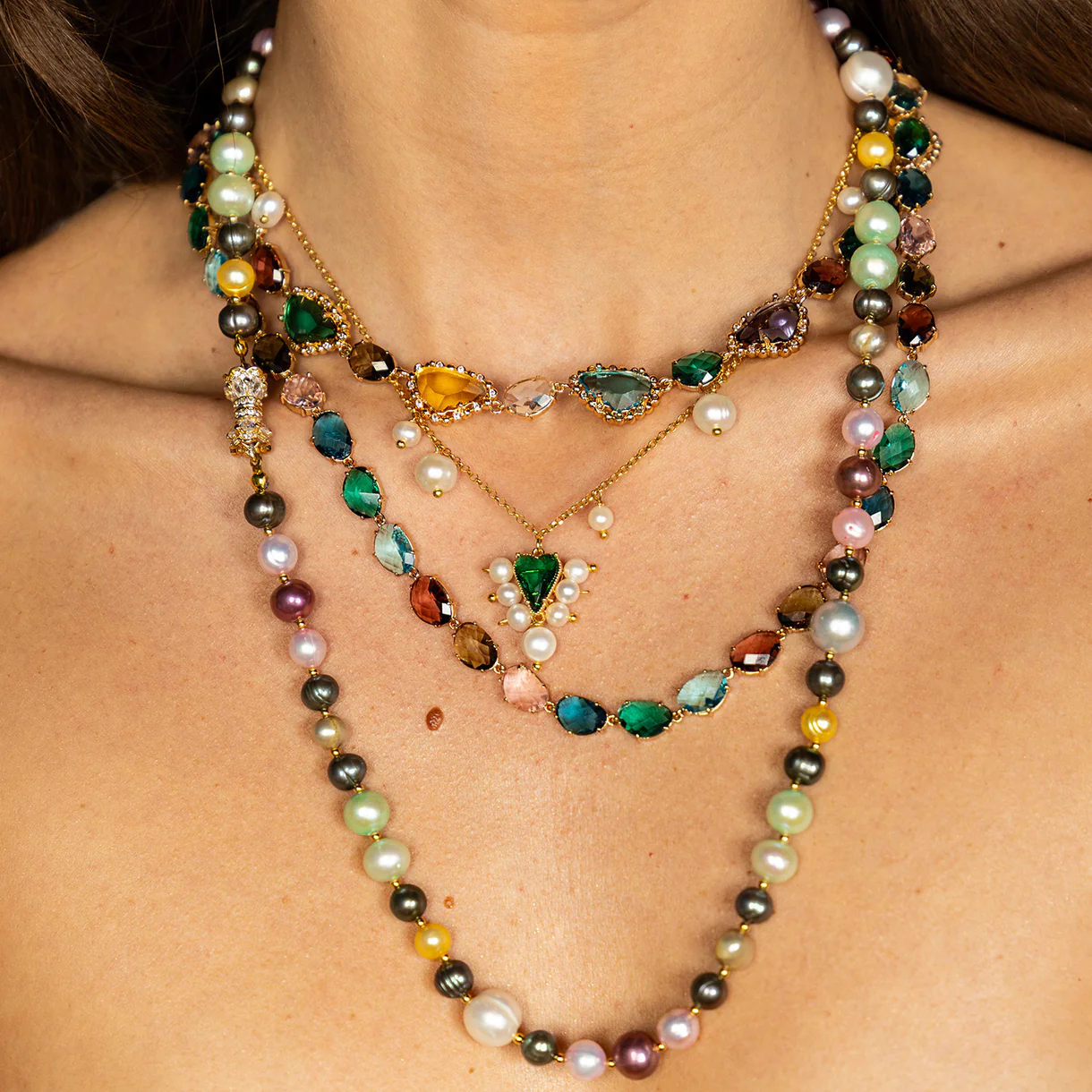 Pearls but make them fancy! Our Albia necklace features a stunning array of pearls, each carefully selected for its unique color, ranging from classic whites to deep, iridescent hues. The pearls are meticulously strung together to form a harmonious blend. The beautiful clasp, adorned with sparkling crystals, adds a dazzling detail. It secures the necklace and serves as a stunning focal point elevating the entire piece.