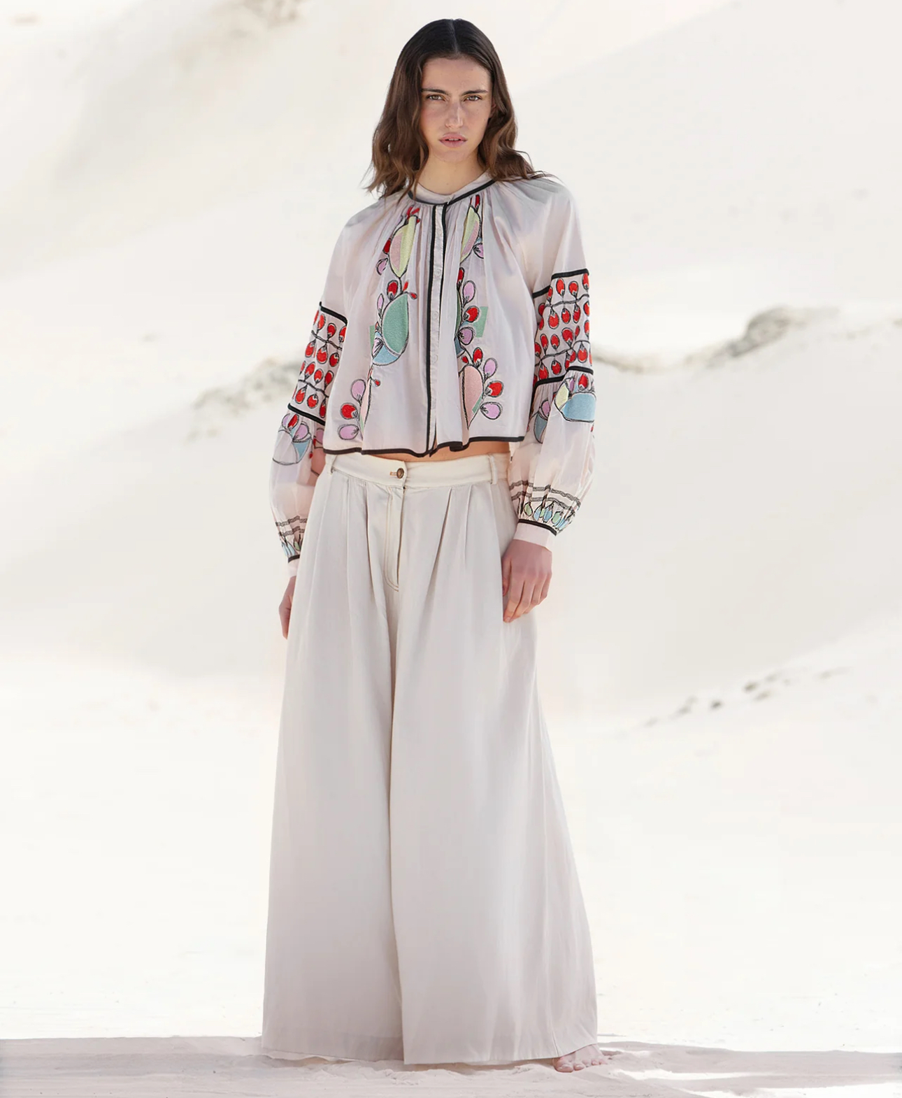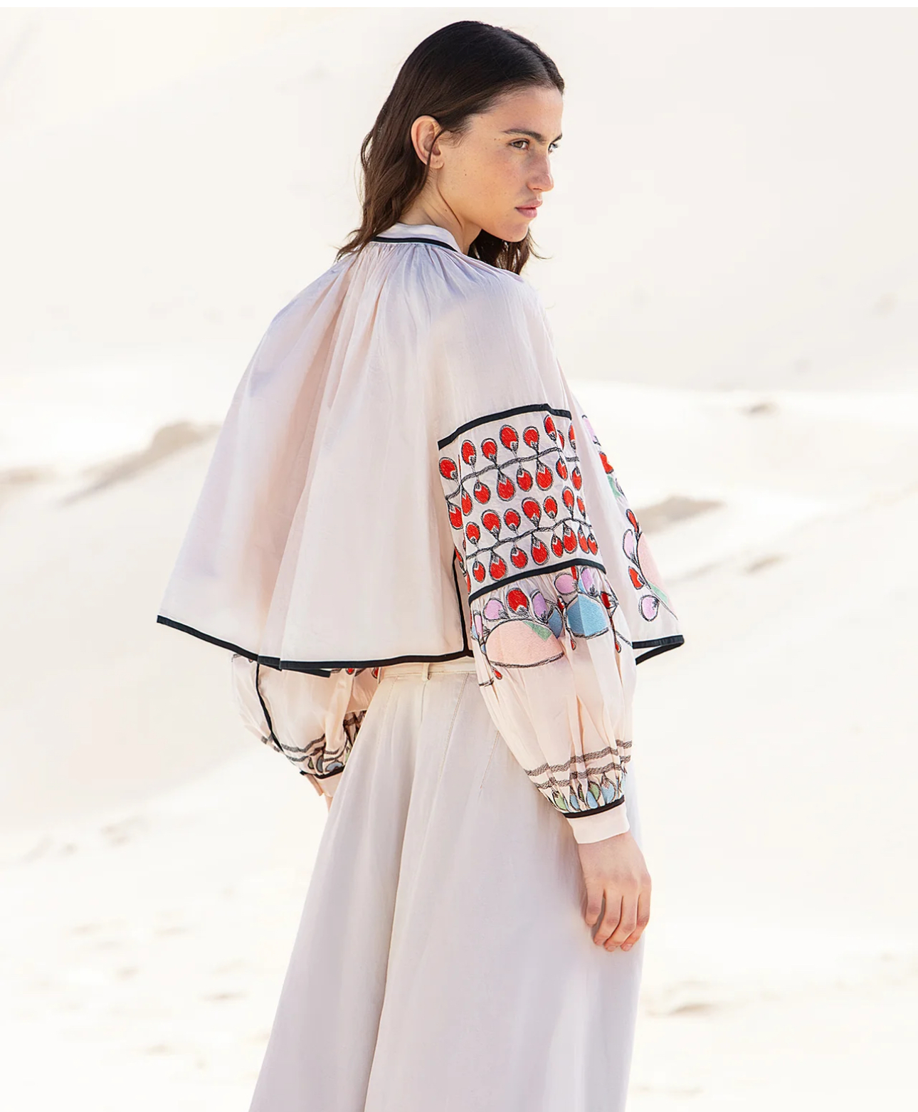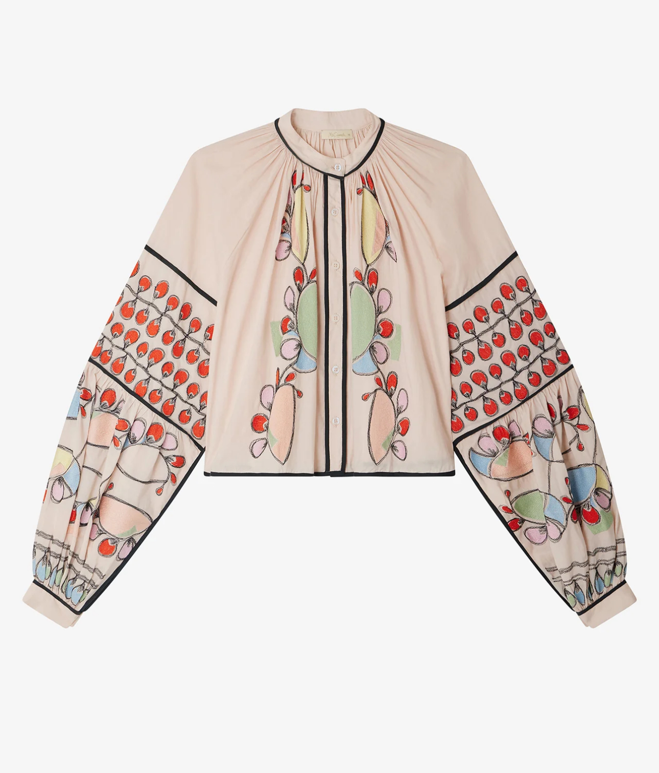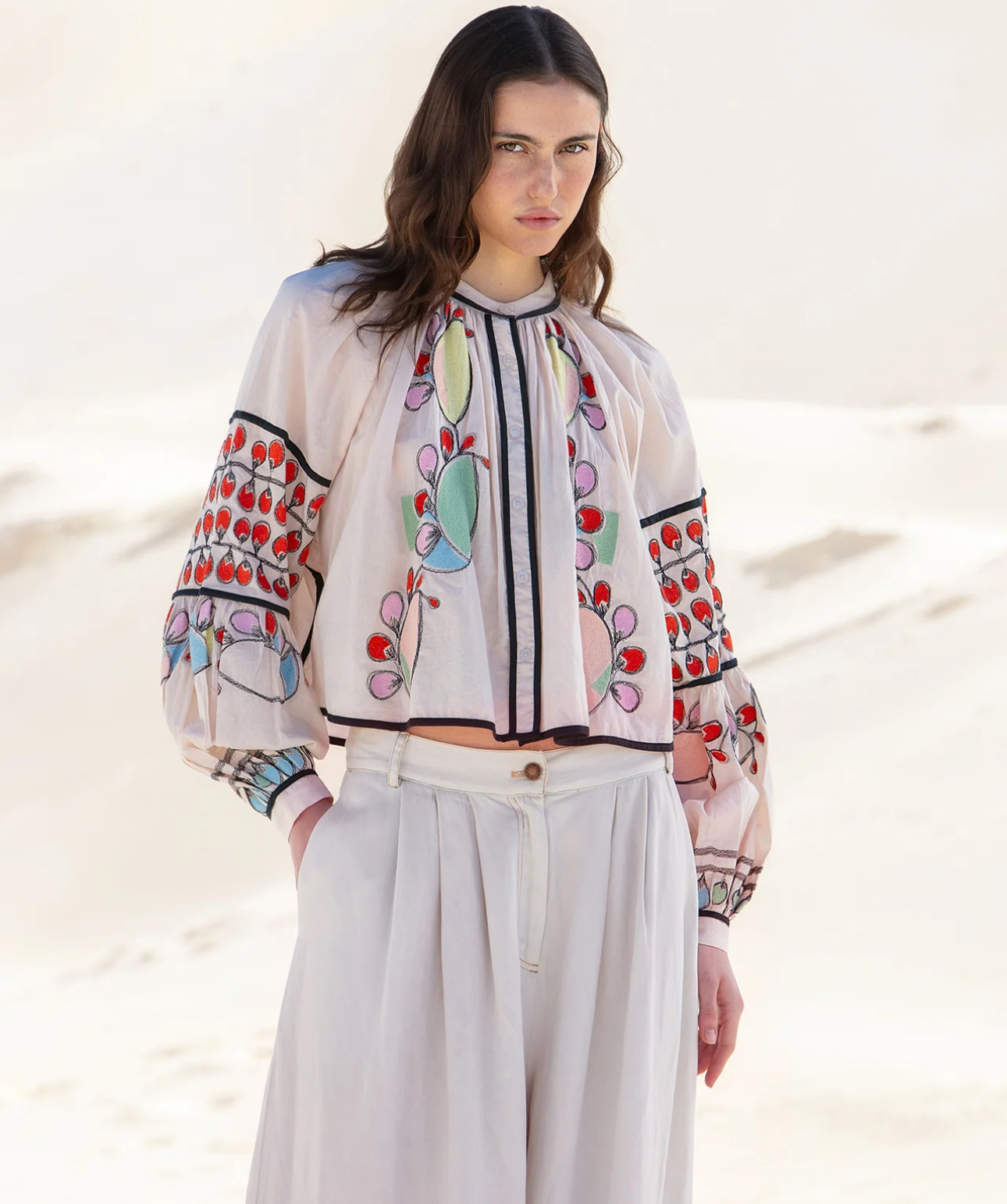This beige cotton voile blouse, delicately embroidered with colorful and playful motifs, combines lightness and originality.