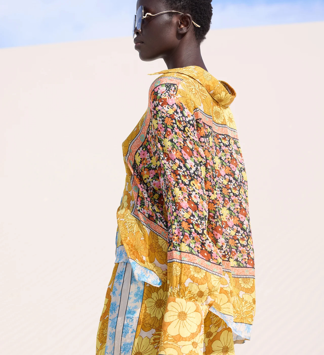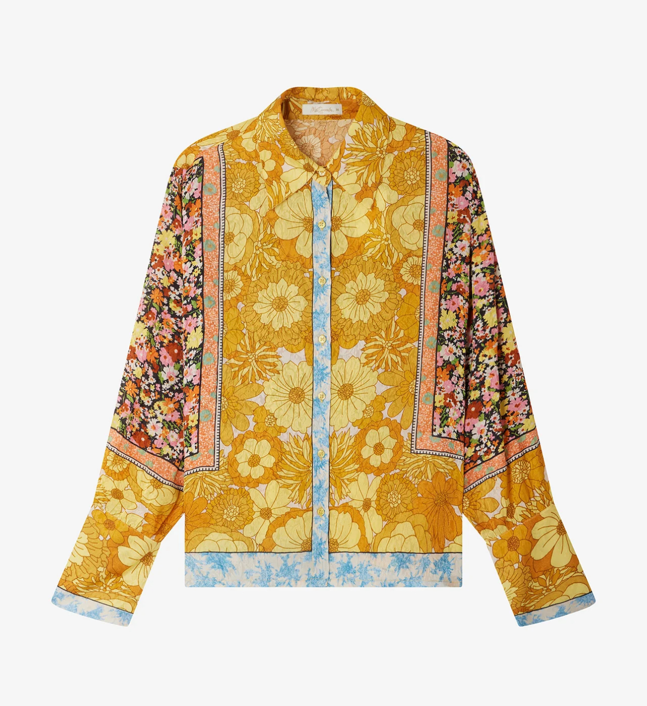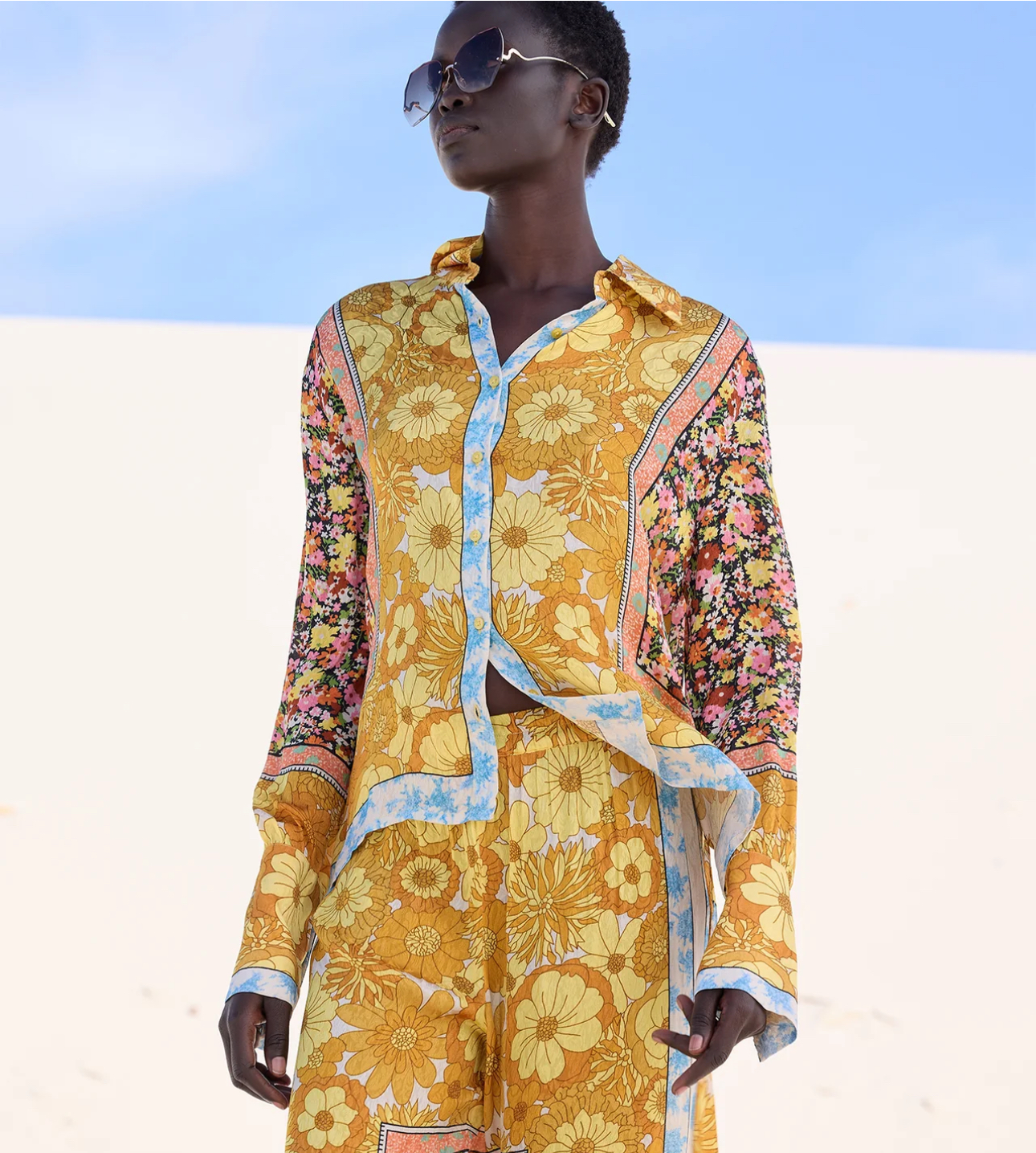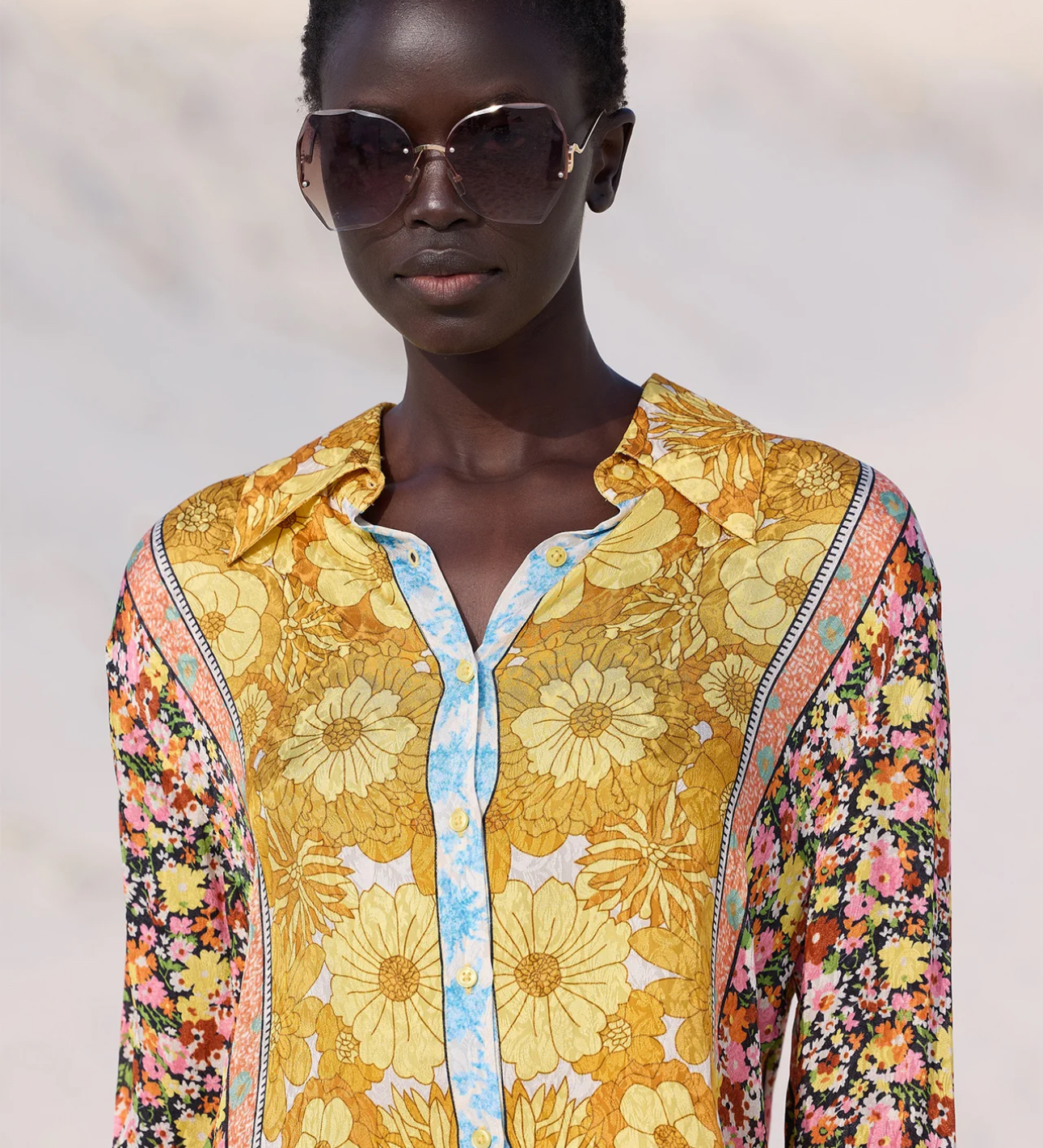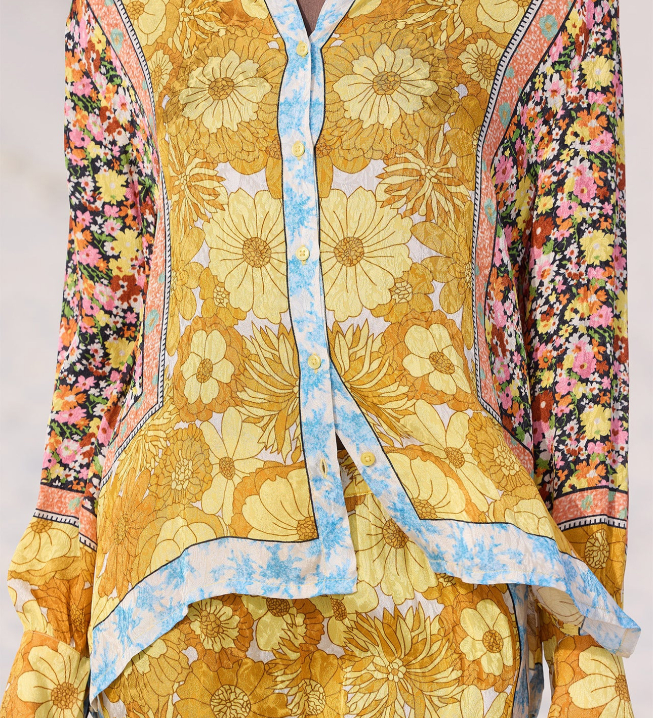 Elegant and light, this straight-cut shirt in jacquard viscose features a vibrant sunflower yellow floral print, enhanced by delicate blue lines placed on the edges.