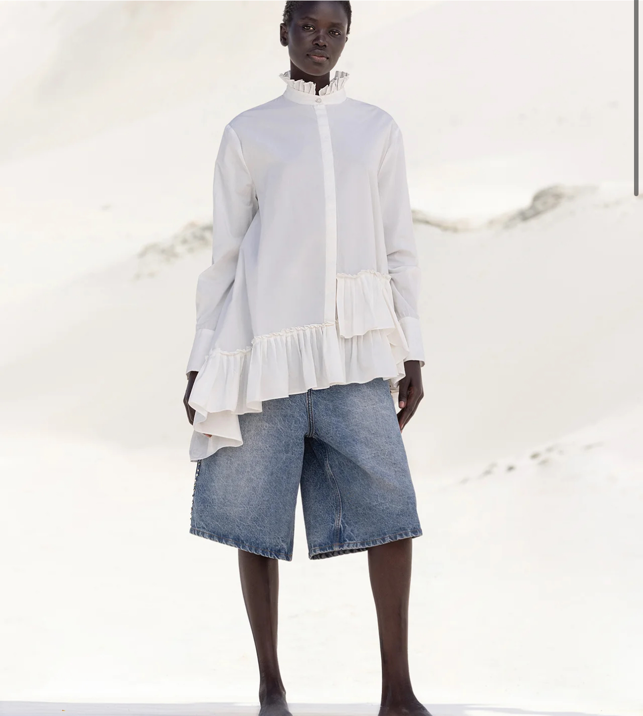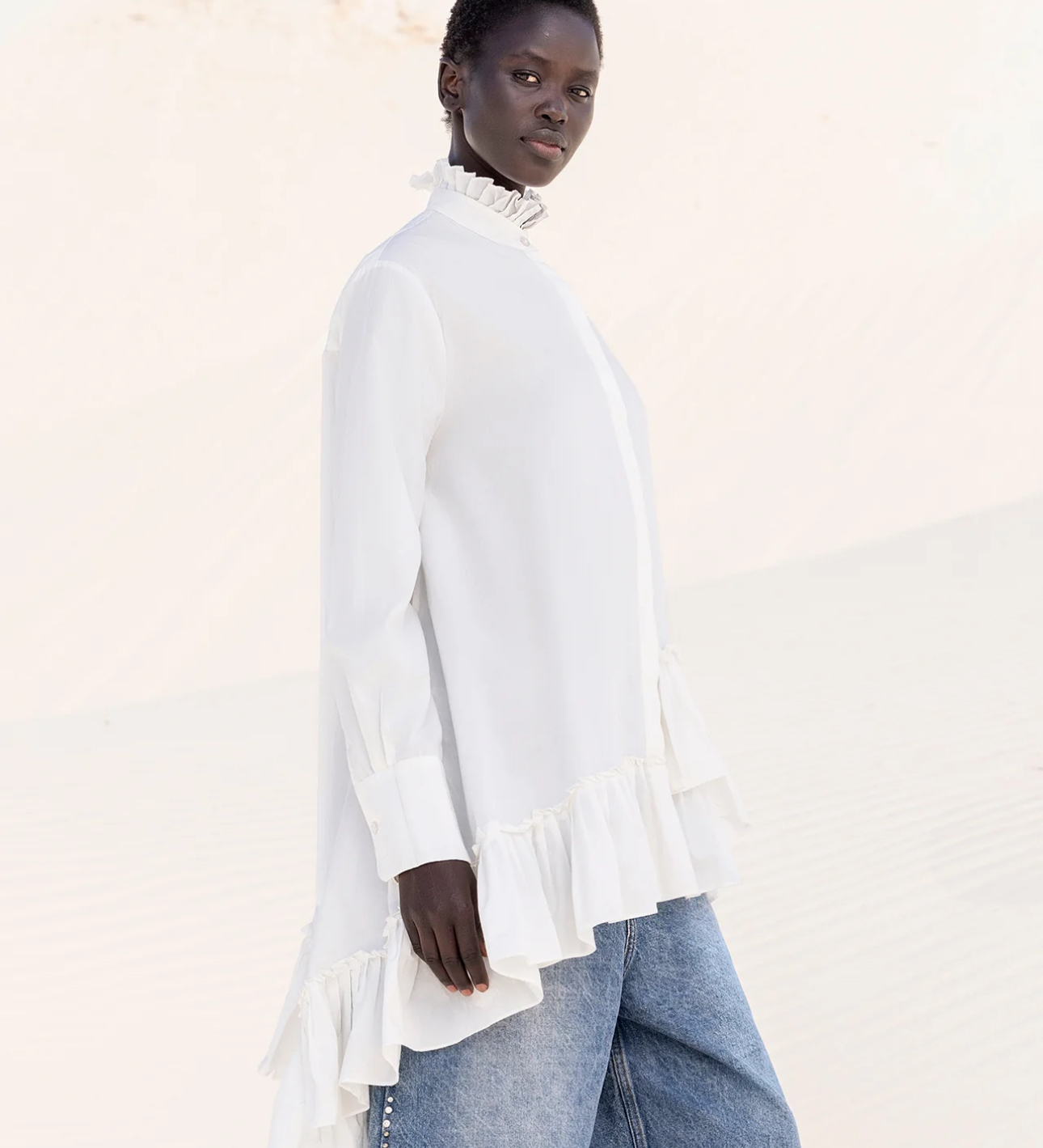 Its innovative cut is longer on one side, creating a captivating asymmetrical effect, while the ruffled hem adds a touch of femininity and lightness.