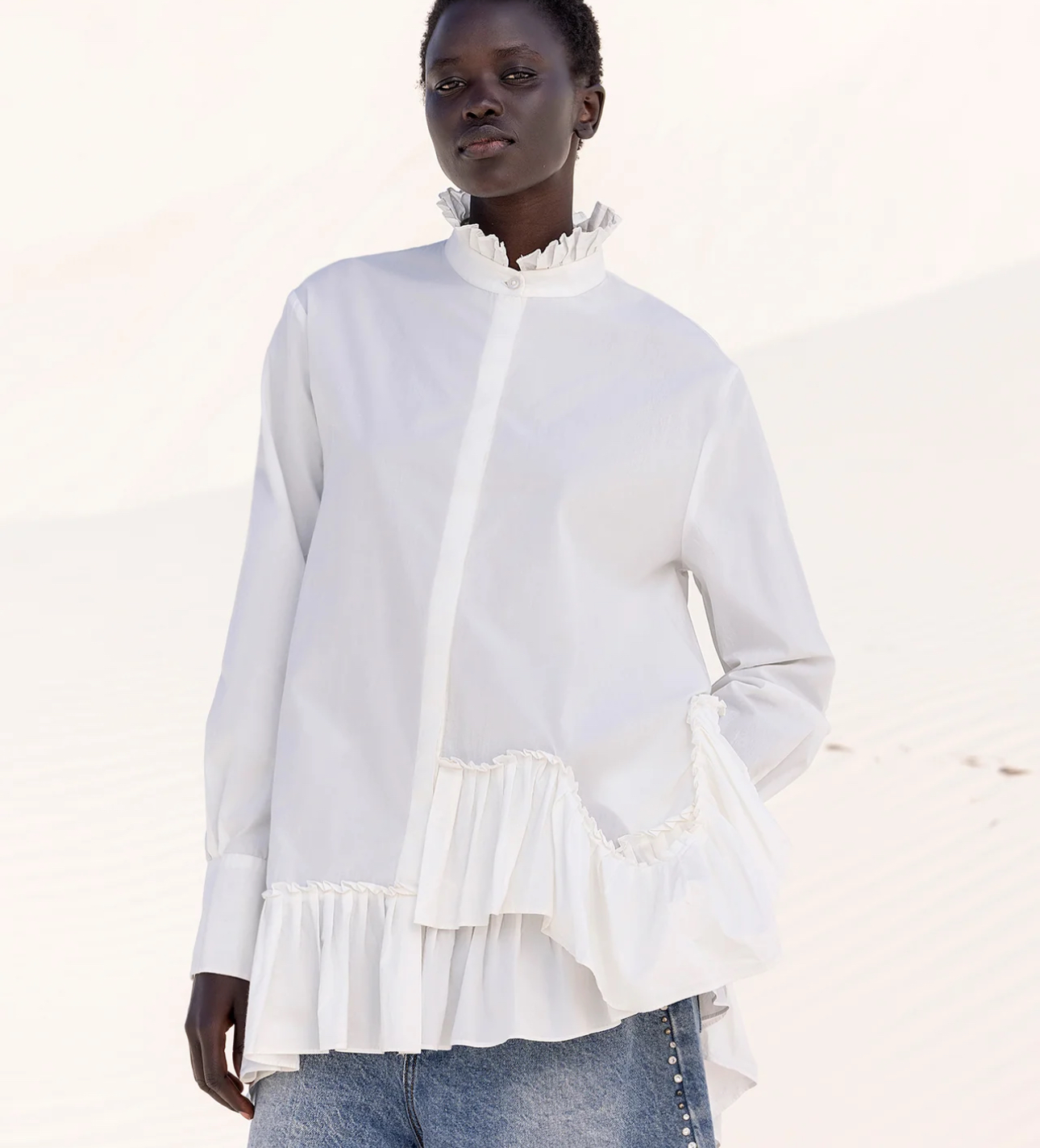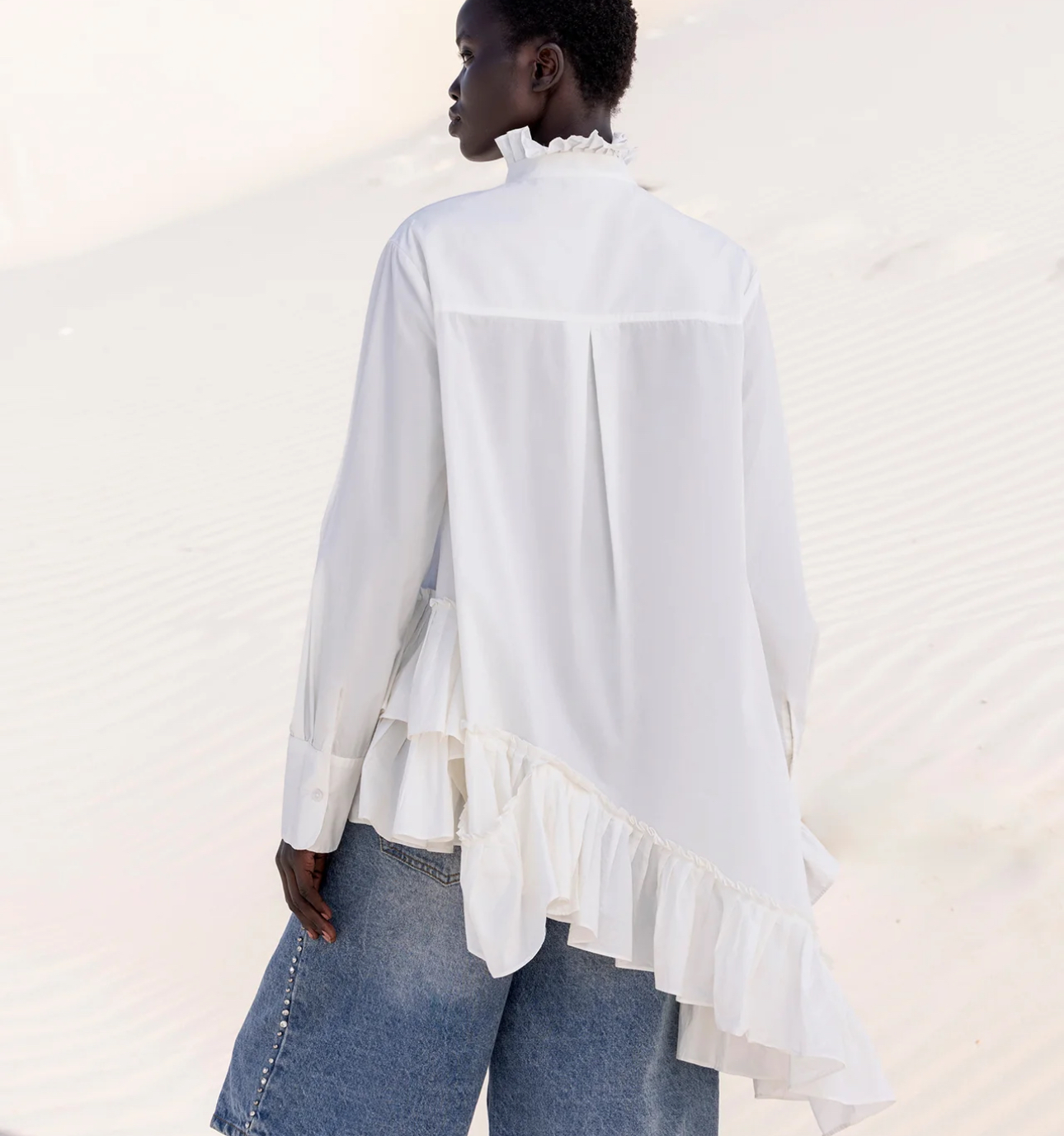 Be captivated by this long-sleeved white cotton poplin shirt, with its deconstructed style and irresistible charm.