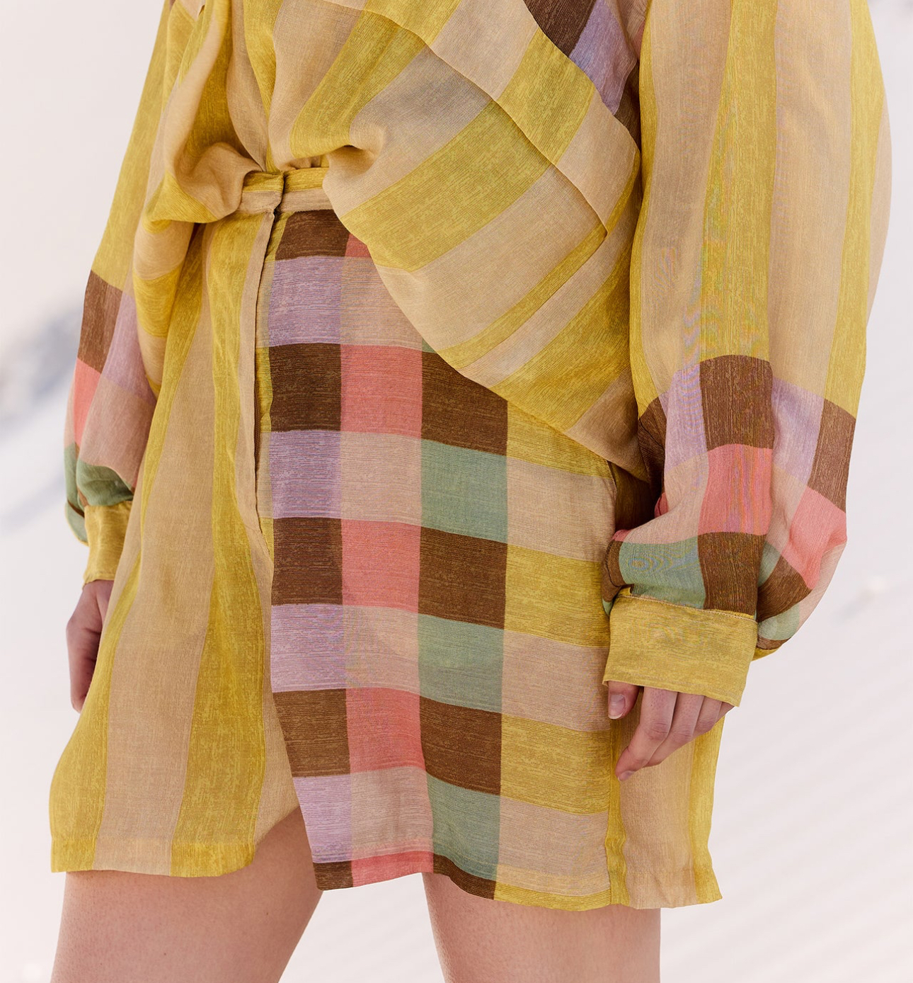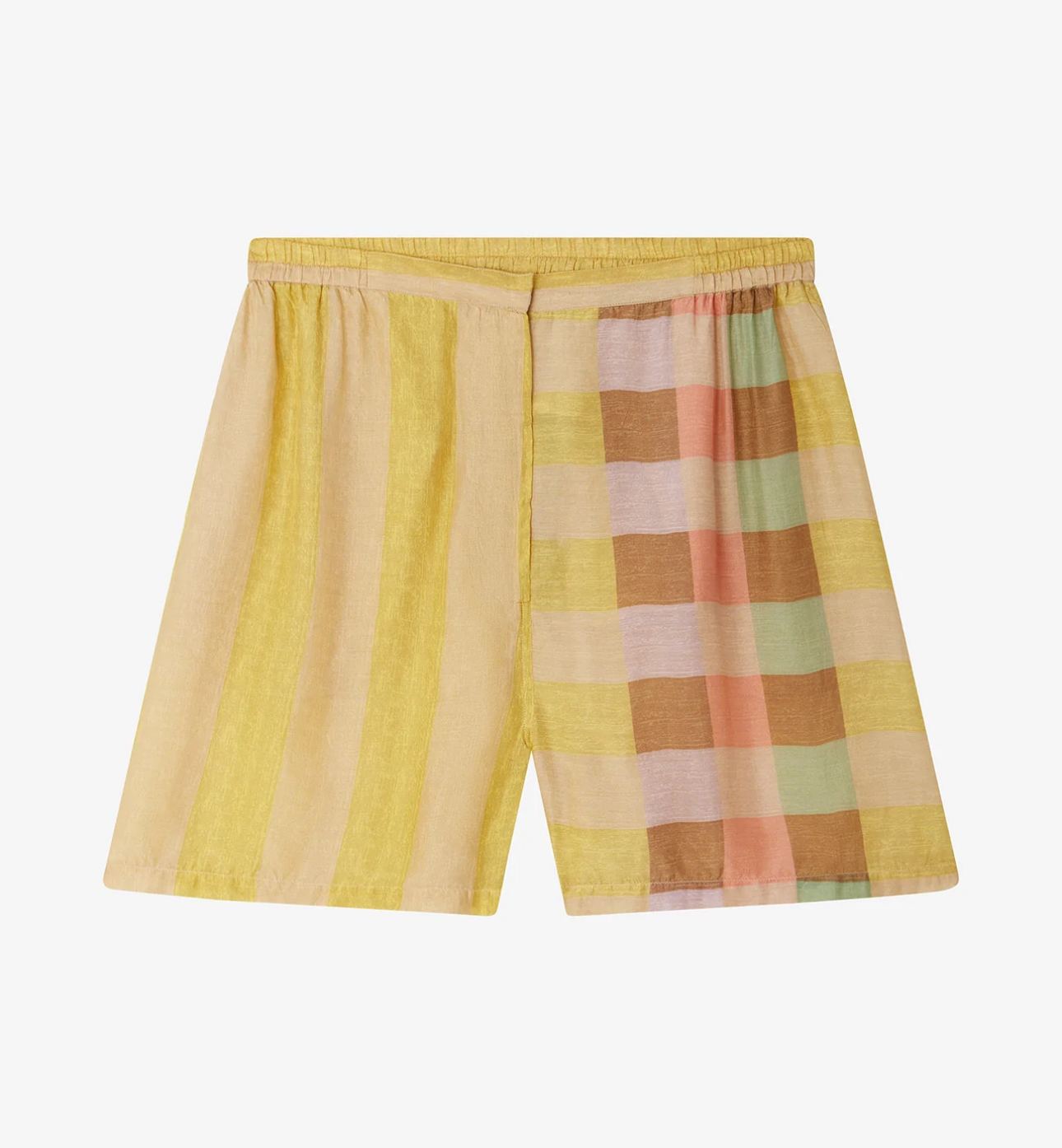 This short bermuda in soft and light modal gauze is elevated with subtle yellow stripes that catch the light. A delicate geometric pattern adorns one leg, adding a touch of originality to the design.