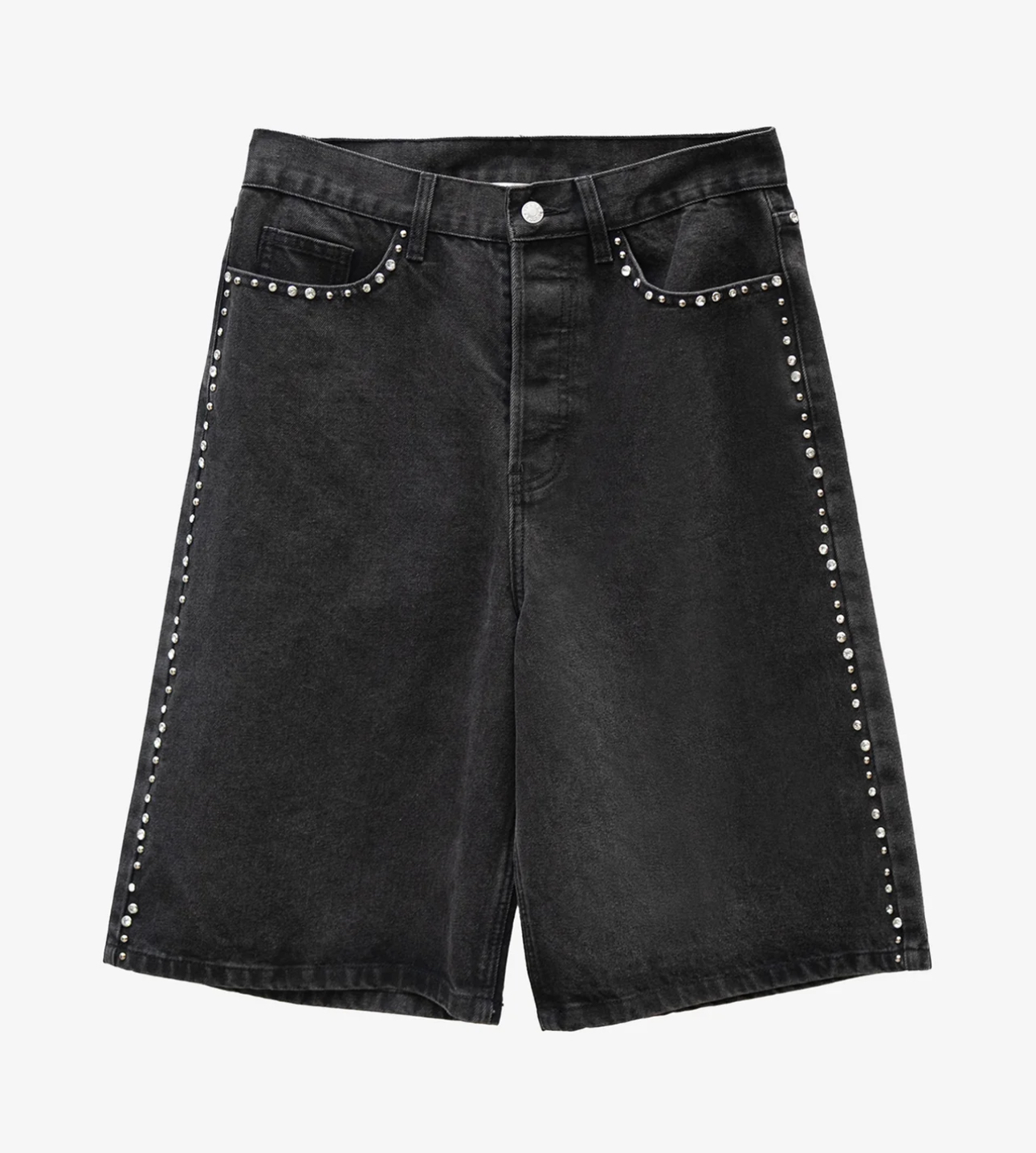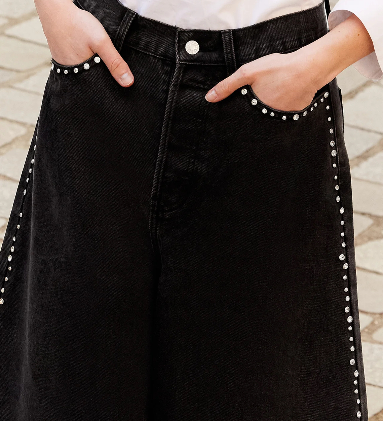 This pair stands out with its embellishments of rhinestones and silver stones, subtly adorning the edges of the sides and pockets, adding a glamorous and sophisticated flair.