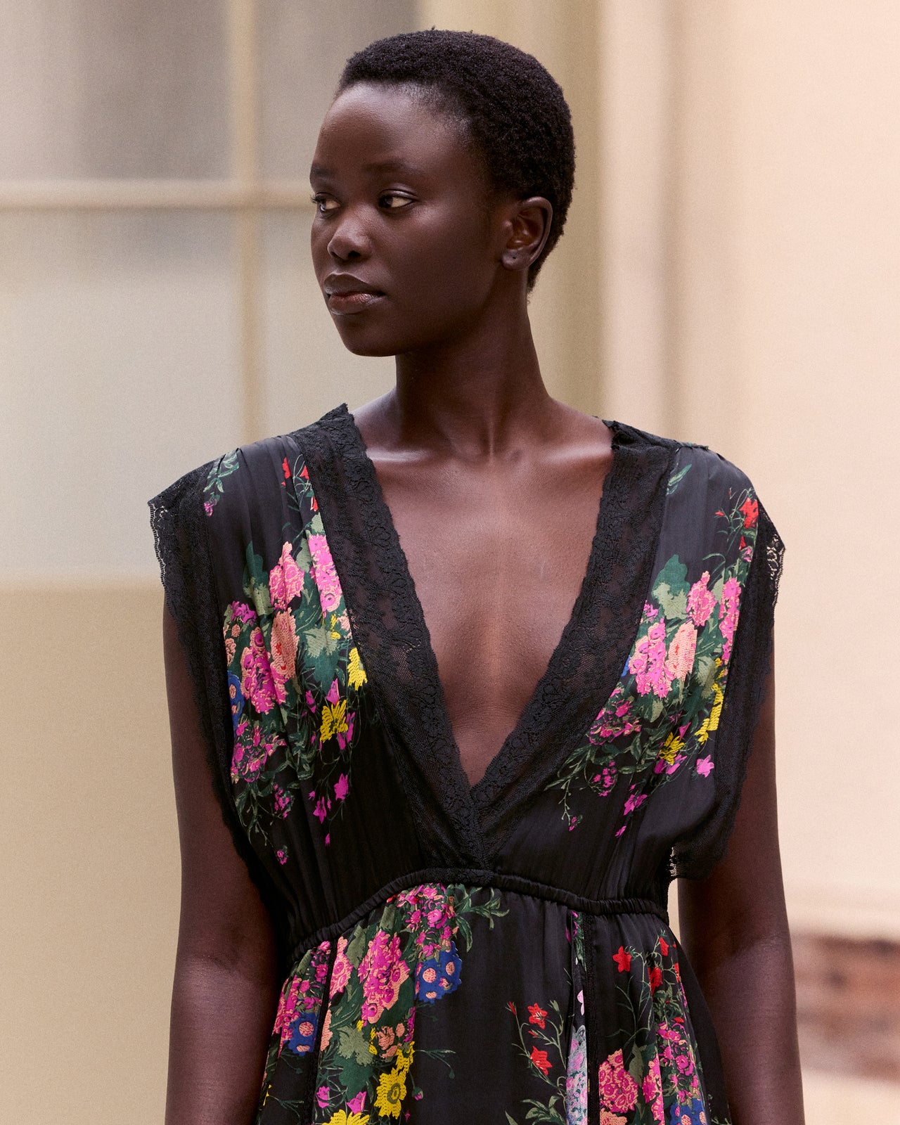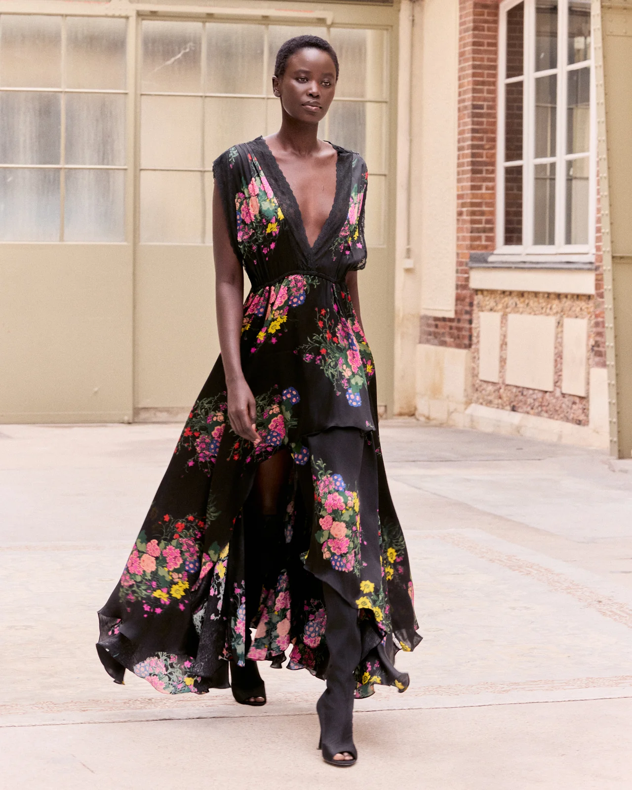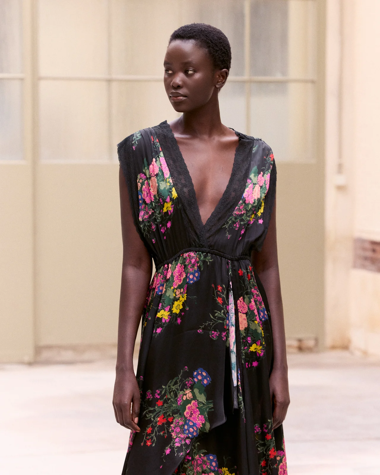 A long, flowing satin viscose dress, enhanced by a vibrant multicolored floral print on a black background. Its asymmetrical wrap style adds movement and an elegant, feminine silhouette. The plunging V-neck and delicately inset lace details accentuate the dress’s sensuality. The loose, flowing shoulders balance the figure, while the cinched waist provides a refined, structured look.